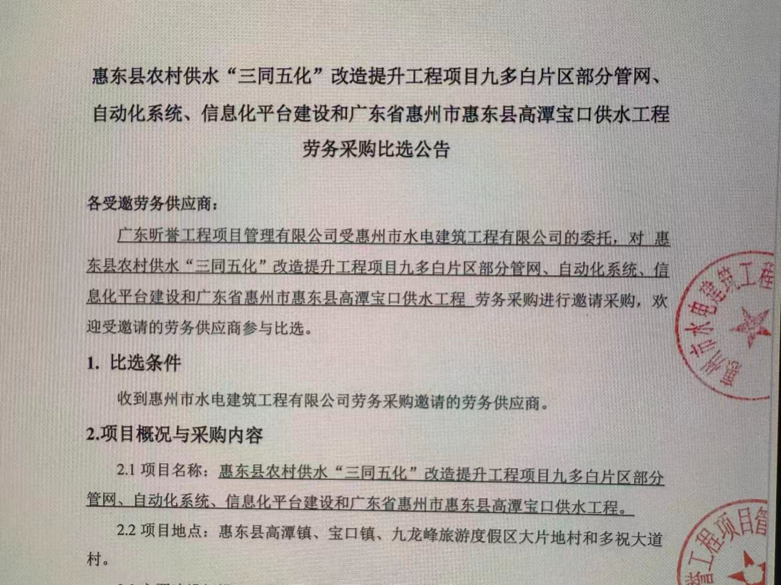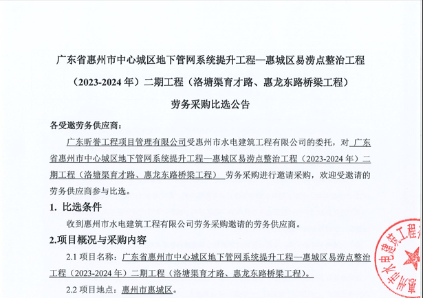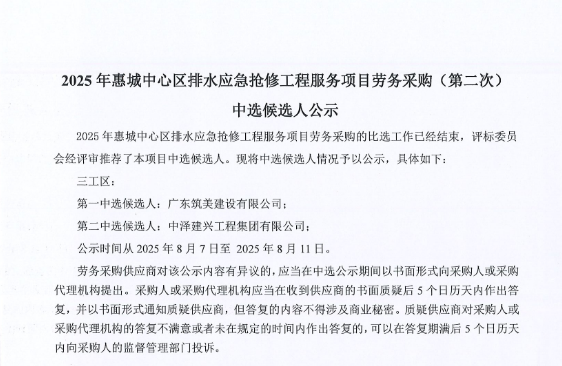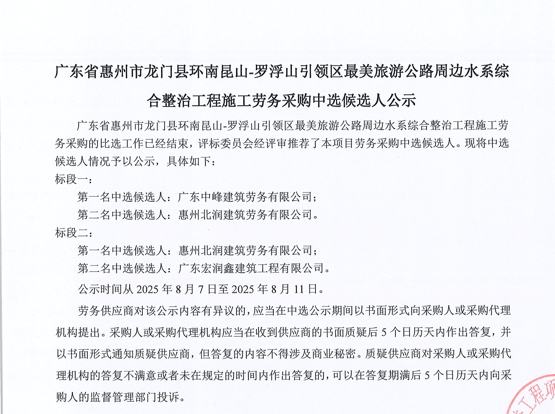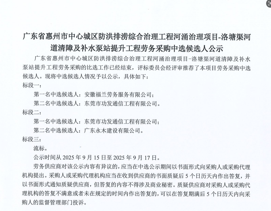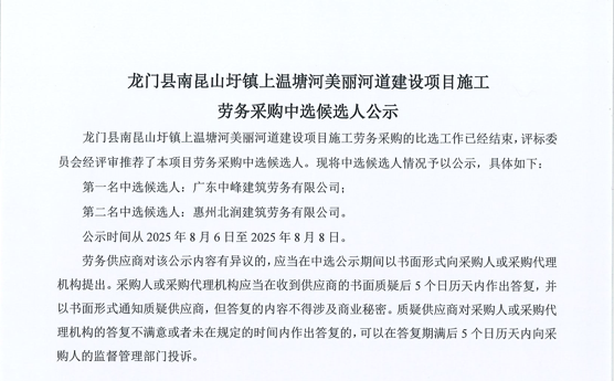 惠州市增江龍門段治理工程施工(一標段)勞務采購中選候選人公示……